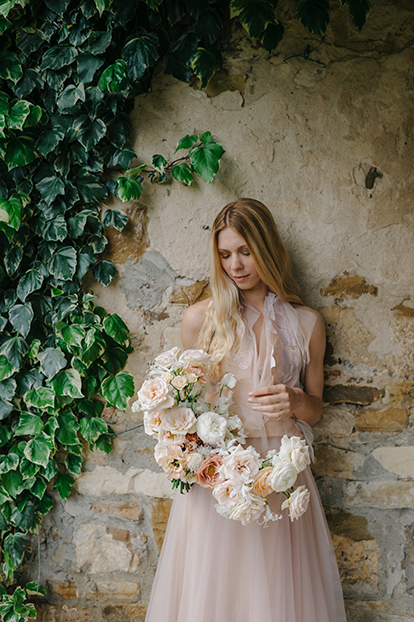 Anthurium è un corpetto in shantung di seta lavata allacciato al collo con la schiena nuda. Il delicato ricamo floreale è realizzato su strati di organza sovrapposti in diversi toni rosati. Si completa con la gonna di organzino a tre strati, sovrapposta alla seconda gonna in rasone cipria (che si può indossare anche da sola) Tutto è regolabile a piacere con stringhe e coulisses.