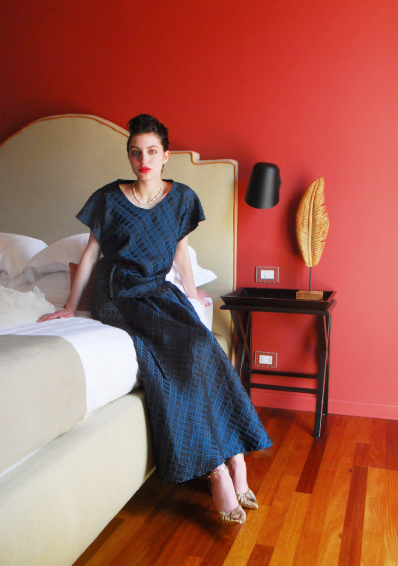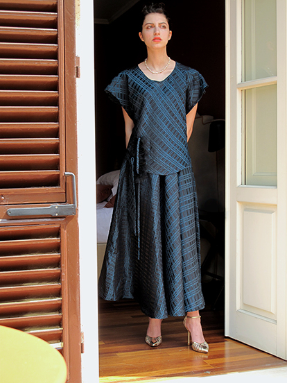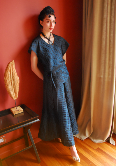 Sposarsi in municipio con il completo Blue, elegante ma insolito. Si compone di un corpetto regolato da un nastrino e di una gonna longuette tutta a ruota con un nastro interno nel fianco, che permette un gioco ulteriore di drappeggio e lunghezza. Il tessuto è un broccato geometrico leggerissimo lucido-opaco. Accessori coordinati: una collana di perle vintage mescolate con perle Swarovski, il foulard di tulle con nervature e la seconda collana con il cuore di metallo dipinto.
