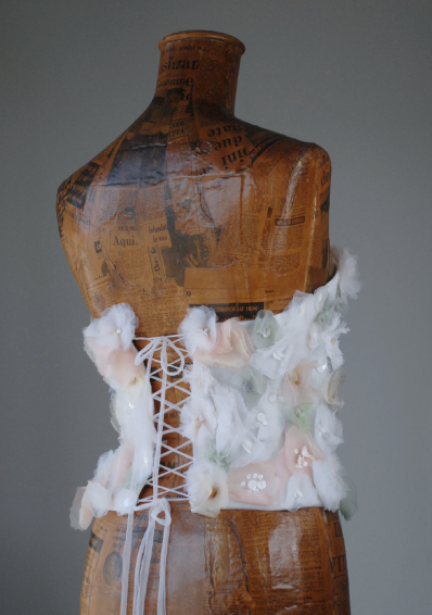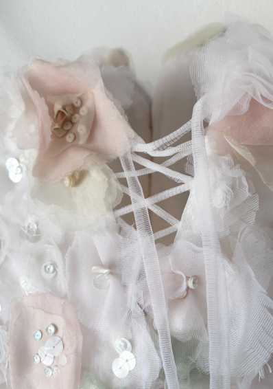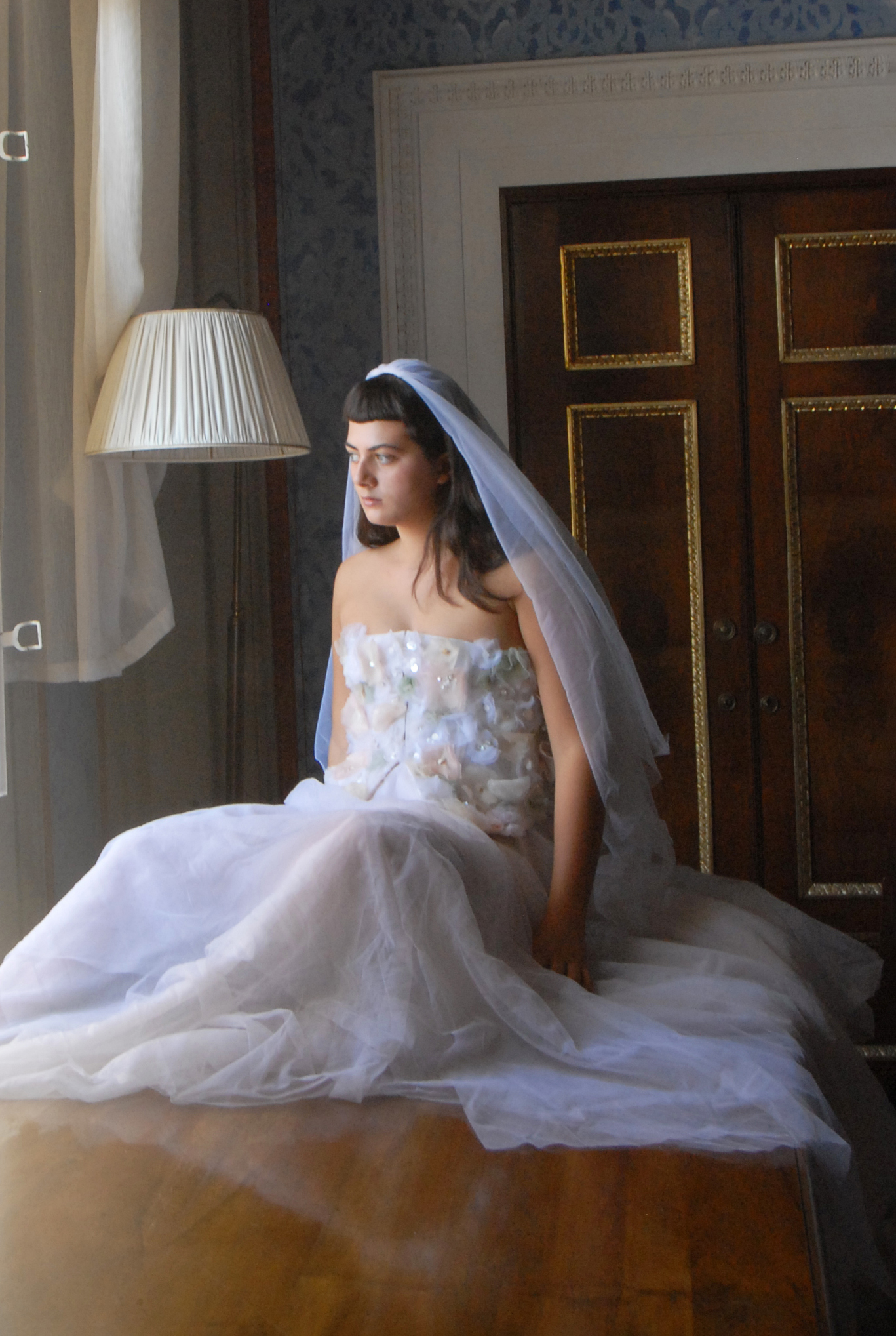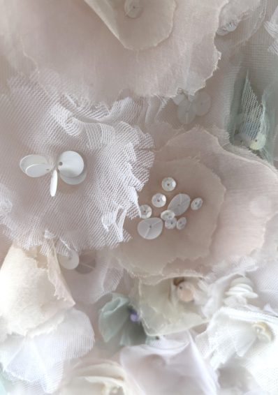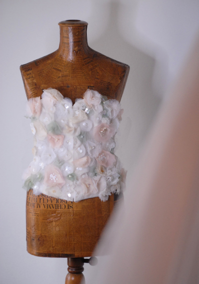 Fiorissima è un completo da sposa molto romantico e delicato: Il leggerissimo corsetto è totalmente ricoperto di mille fiori di tulle e organze pastello, con pistilli di paillettes ricamati. Particolari “di una volta” : una dolce stringatura di tulle dietro e con ganci da corsetteria davanti. Si completa con la gonna lunga realizzata con tanti strati di tulle rosa sfumato.Molto speciale indossato con il velo.