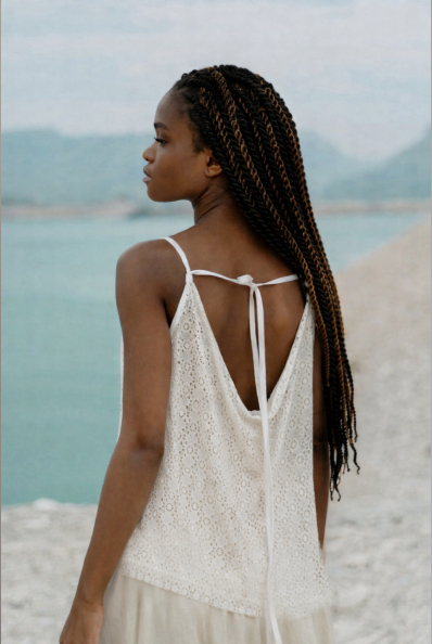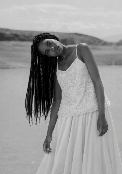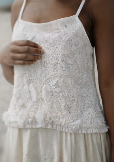 Stratificare memorie, utilizzando un pizzo antico di cotone applicato su un’altro e fermato da un ricamo preziosissimo di cristalli, perle e raffia, realizzato a mano con un’artigianalità toscana unica. Schiena con drappeggio regolabile. Gonna a ruota in shantung [su richiesta] Poesia upcycling.