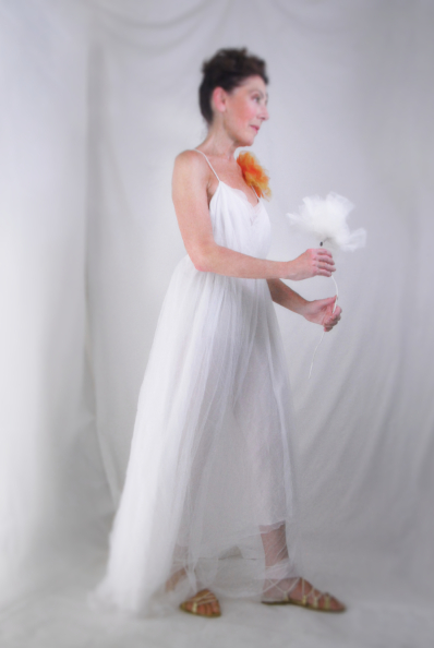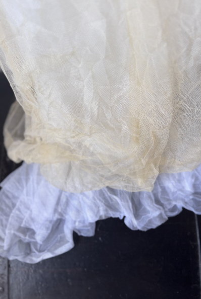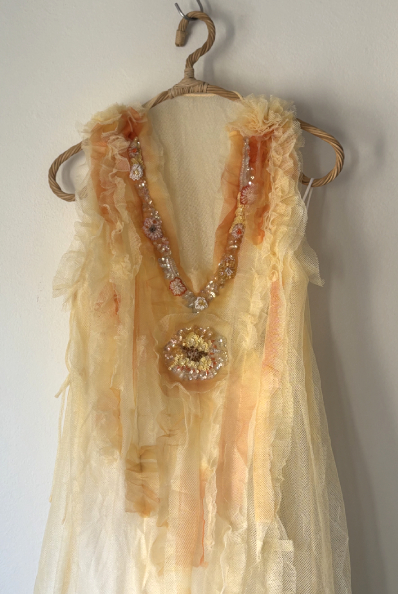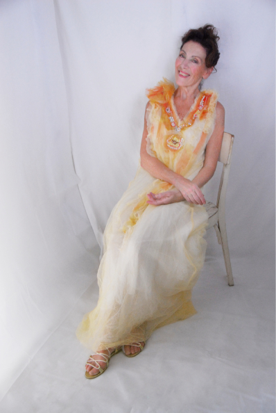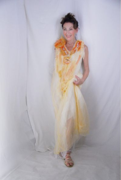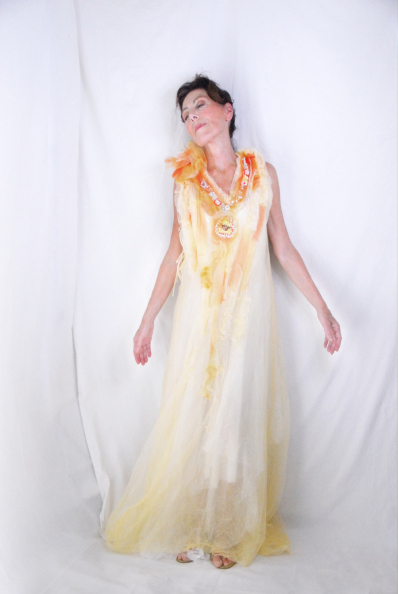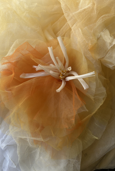 Completo artistico, prezioso e leggerissimo da indossare. Due abiti sovrapposti nello stesso tulle increspato : il primo ha strati sfumati arancio, con una ricca lavorazione di ruches a cascata, illuminata da un ricamo di cristalli e paillettes con effetto collana. Un fiore amovibile l’accende di colore. Il secondo abito a sottoveste avorio è più lungo e crea ulteriori giochi di movimento.