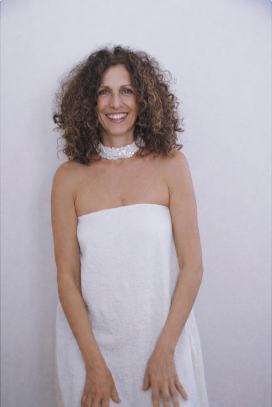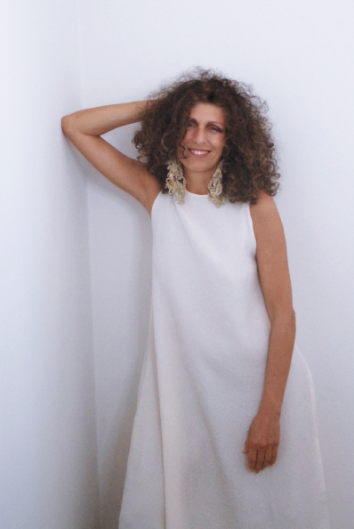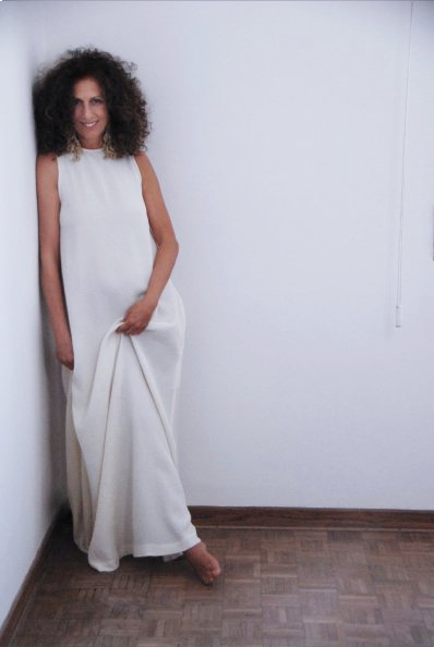 Il rigore diventa femminile con linee di apparente semplicità: Luna (tunica) in tessuto cloqué doppiato, tagliato tutto in sbieco con apertura a fessura sulla schiena e tasche nel fianco.