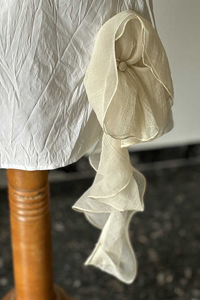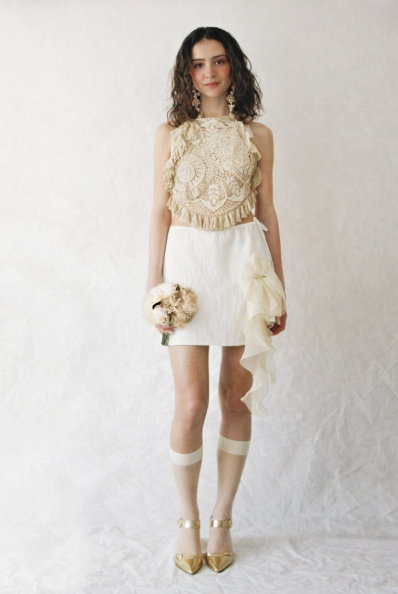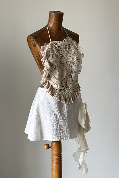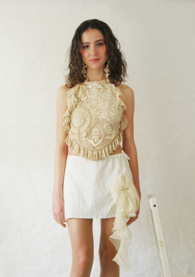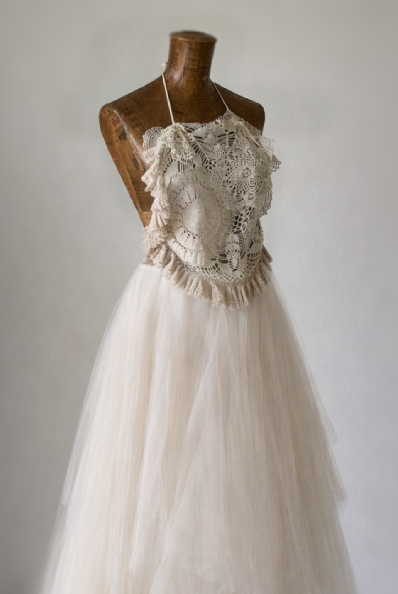 Mescolando ispirazioni e stili diversi, nasce un insieme pensato per un romantico matrimonio sul mare. Il top e’ realizzato solo con elementi di uncinetto vintage,sovrapposti e intarsiati tra loro, foderato di organza di seta. L’uncinetto e’ stato tinto in diverse sfumature di colore ottenute con il the’, proprio come si faceva una volta. La minigonna trapeze e’ in bianco taffettas poly, stropicciato a caldo e doppiato di rete per creare effetti cangianti nel movimento, con una grande rosa di organza sembra cadere dalla gonna, aggiungendo un insolito dettaglio dal romanticismo inaspettato.