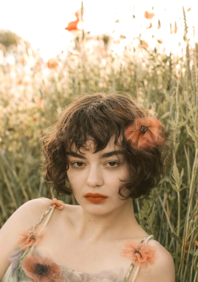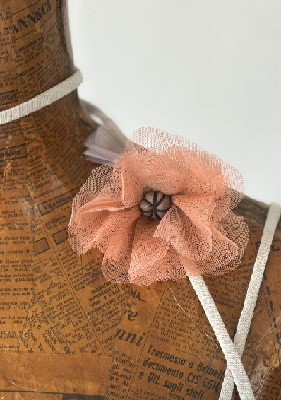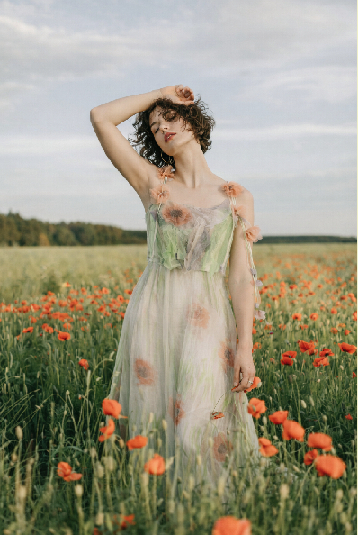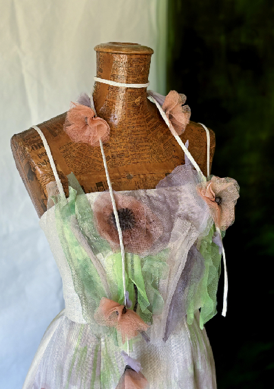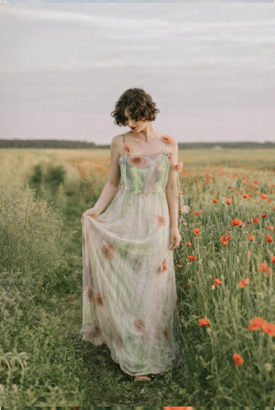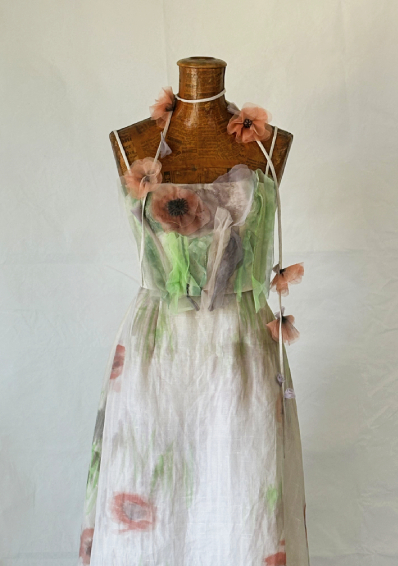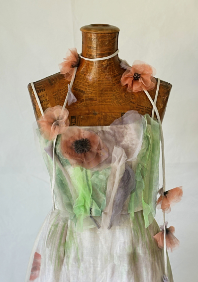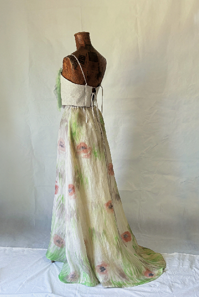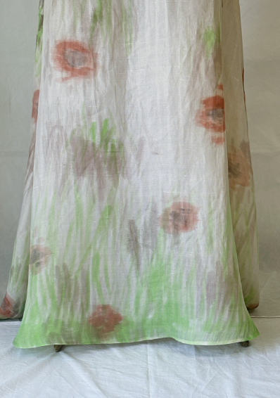 La sposa indossa l’estate: il corpetto di lino corda ha applicazioni in tulle dipinto, per ricreare i papaveri nel campo di grano verde (si allaccia facilmente dietro con piccoli fiocchetti) la gonna in organza doppia di seta avorio, é tutta dipinta a mano in modo leggero e tutta doppiata di organza froissé, per avere un delicato ondeggiare nel movimento.