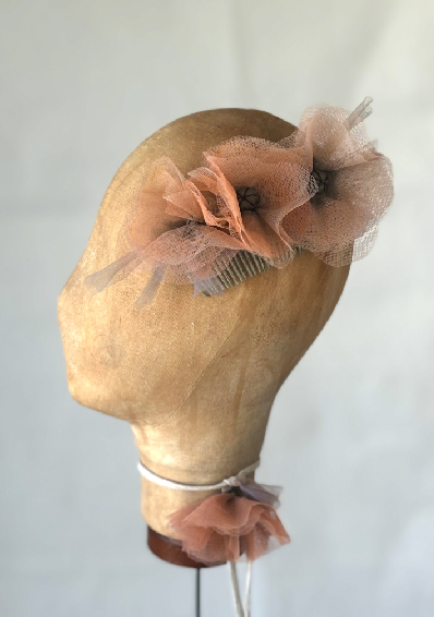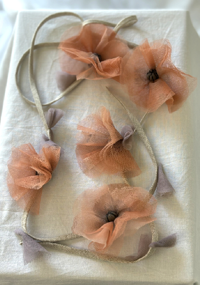 accessori diversi in tema: nastro di lino multiuso con papaveri e boccioli, pettine con grandi papaveri, bracciale con papavero e foglie, cappello in paglia fine decolorato con fiore.