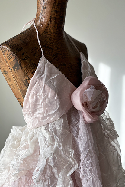 Un abito molto particolare e poetico. Tutto realizzato con organze lucide ed opache accartocciate e tinte a mano in preziose tonalità di rosa impalpabili unite in patchwork. Linea a palloncino e scollatura a sottoveste con una grande rosa (amovibile)che puntualizza la scollatura. All’interno dell’abito una microgonna in crêpe vela la trasparenza. Materiali 100% sostenibili antichi introvabili.