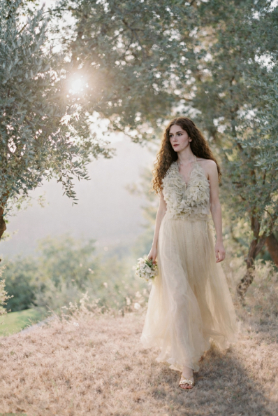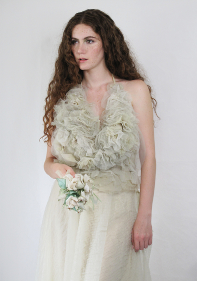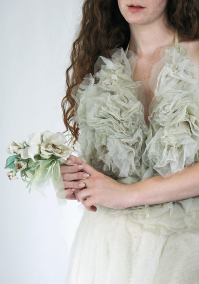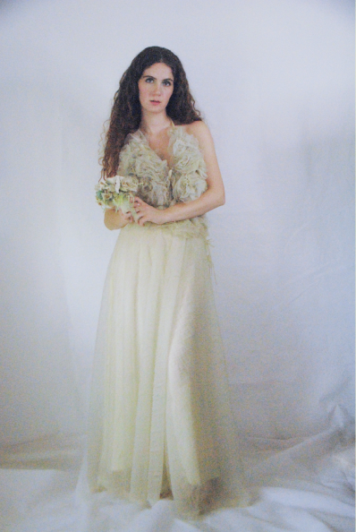 Rose verdi è un completo immaginato per una Sposa eterea e sognante : il corpetto leggero é completamente ricoperto di rose di tulle e organzino, tinti a mano in sfumature impalpabili dal limone al verde polvere. Il bouquet coordinato ha rose verdi grandi e piccole, colore simbolo di positività. Il corpetto dalla forma femminile ha scollo all’americana aperto davanti (regolabile) e schiena completamente nuda, trattenuta da due semplici stringhe in rete di tulle. La gonna svasata è lunga alla caviglia e realizzata in un’unico incredibile tessuto a piegoline tinto a mano, foderata di crépe de chine lavato.