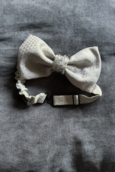 10-11-12- Coordinato papillon e boutonniere -fiore in seta jacquard grigio pale, ricamati con cristalli trasparenti.