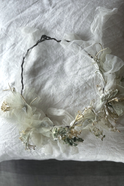 19-20-21- La coroncina diventa genderless, con tutto il romanticismo di piccoli fiori dipinti a mano e nastri di organzino sfumato.